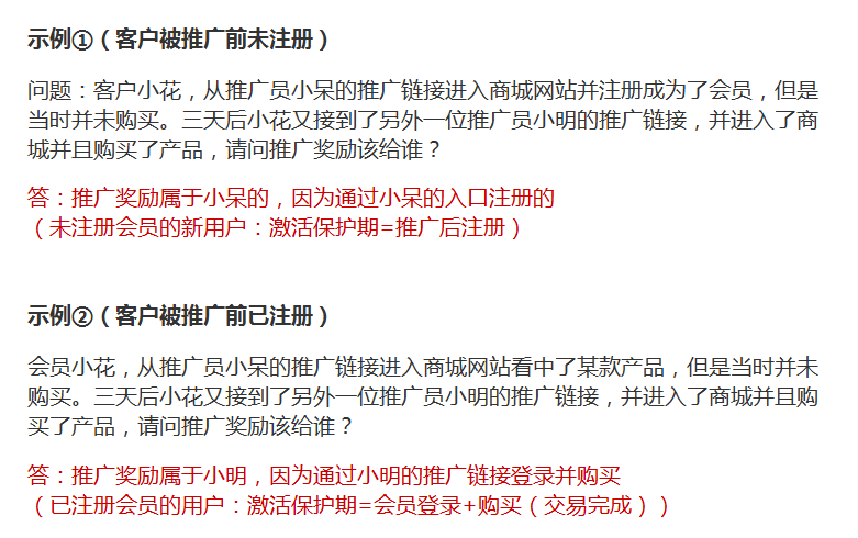 客戶保護期的定義為“當用戶首次進入某推廣員的鏈接/二維碼并購買產品或注冊成為會員時,該用戶在指定的保護期內則綁定為該推廣員的客戶,之后無論用戶去到哪里下單(其他推廣員的鏈接或者總店),推廣員都可以得到獎勵;當保護期到期后,用戶再點擊鏈接,則保護期自動續(xù)期,如保護期為15天,則續(xù)期15天”。