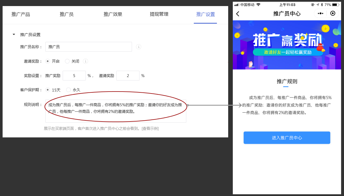 a-4.規(guī)則說明:可自定義推廣員的推廣規(guī)則,規(guī)則將會展示在買家端頁面,當客戶首次進入推廣員中心之前會看到。