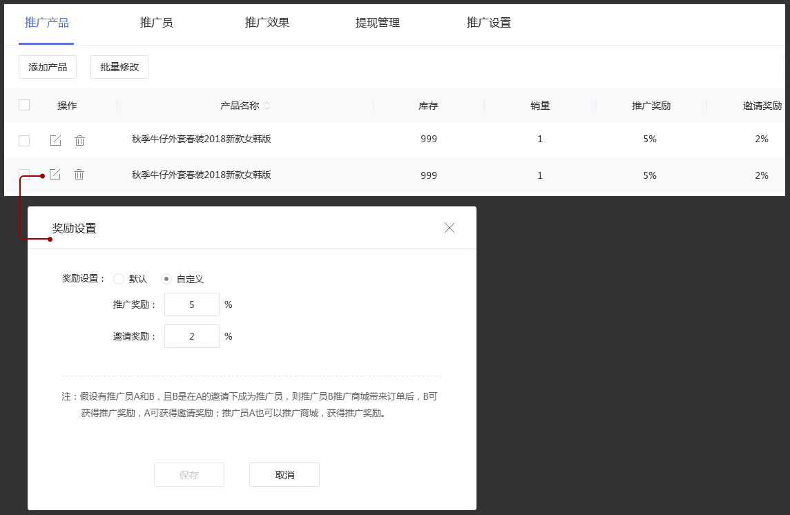 a-2.邀請獎勵:可選擇開啟或關閉。開啟時,為二級裂變,可自定義推廣獎勵和邀請獎勵的百分比。關閉時,為一級裂變,只能自定義推廣獎勵的百分比,邀請獎勵的百分比設置將會隱藏。