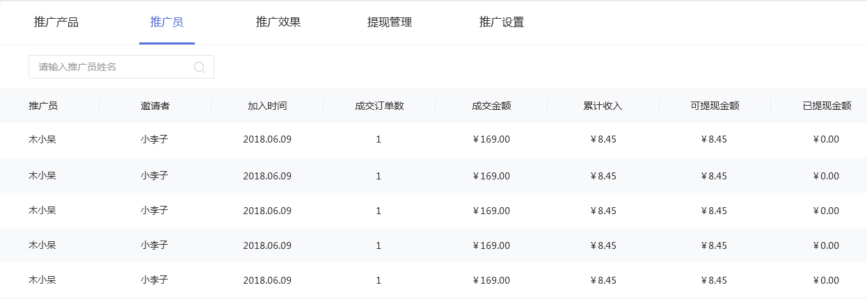④點擊“推廣員”標簽項,您可在此處查看推廣員列表,每個推廣員會顯示其邀請者、加入時間、成交訂單數(shù)、成交金額、累計收入、可提現(xiàn)金額、已提現(xiàn)金額。