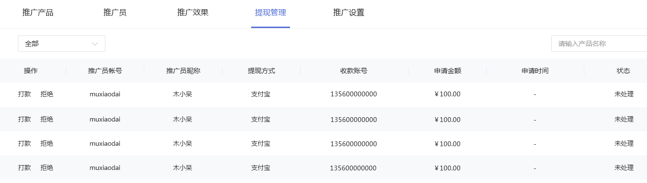 當選擇結算方式為“系統(tǒng)自動結算”時,商家只需在推廣員發(fā)起獎勵提現(xiàn)時,進入“網(wǎng)站管理后臺--營銷--推廣員--提現(xiàn)管理”處點擊【打款】,系統(tǒng)會自動打款到推廣員的提現(xiàn)賬戶?!跋到y(tǒng)自動結算”支持提現(xiàn)到支付寶和微信零錢,但商家成功使用此結算方式的前提是:已在網(wǎng)站管理配置微信支付,并在微信支付商戶平臺開通了企業(yè)付款功能;已在網(wǎng)站管理配置支付寶支付,并在支付寶商戶平臺開通了單筆轉賬到支付寶功能。