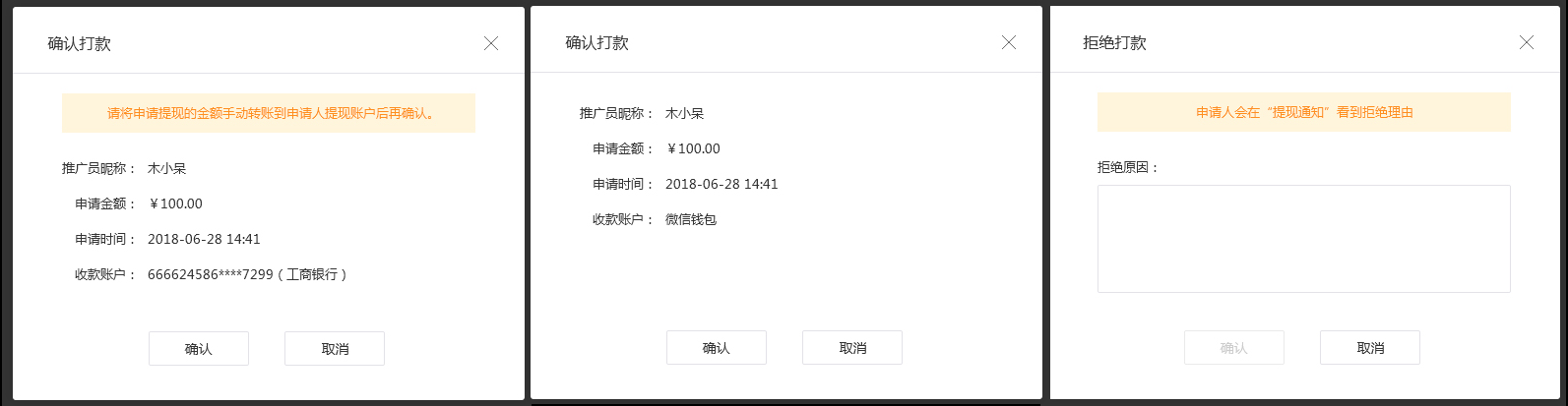 當選擇結算方式為“商家手動結算”時,商家需要在推廣員發(fā)起獎勵提現(xiàn)時,線下自行打款給推廣員,然后再在系統(tǒng)進行線上確認【打款】操作。