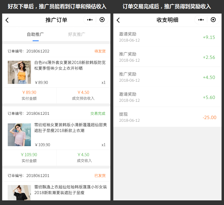③好友下單后,推廣員能在“推廣員中心--推廣訂單”中查看訂單和了解預估收入,訂單交易完成后,得到獎勵收入,在“推廣員中心--收支明細”中可查看每一筆收支詳情。