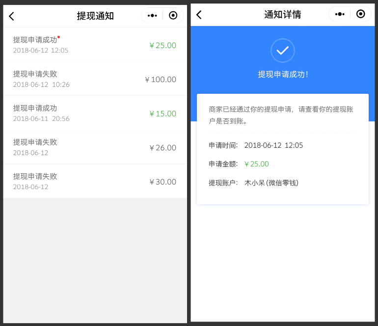 答:不能提現(xiàn)成功,在后臺對應的提現(xiàn)記錄里會顯示“打款失敗,請確保微信支付商戶號(或支付寶商戶號)余額充足,再進行打款”,同時推廣員的“提現(xiàn)通知”會有提現(xiàn)失敗的提醒,失敗原因顯示為“商家支付賬號余額不足,請聯(lián)系商家”。